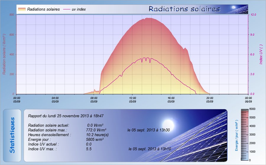 Ephéméride - PDA Prévisions Alertes - Dangers Température Pression - Humidité Solaire et UV Rayonnement solaire Pluviométrie Vent Agriculture Chauffage Danger feux de forêt Info station Activité sismique Astronomie Divers / Liens / Explications Créations / GW / Tutoriels Evénement météo