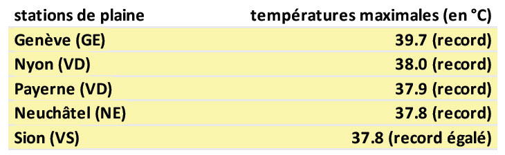 des records absolus: Nyon (38.0 degrés), Payerne (37.9