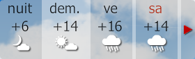Ephéméride - PDA Prévisions Alertes - Dangers Température Pression - Humidité Solaire et UV Rayonnement solaire Pluviométrie Vent Agriculture Chauffage Danger feux de forêt Info station Activité sismique Astronomie Divers / Liens / Explications Créations / GW / Tutoriels Evénement météo