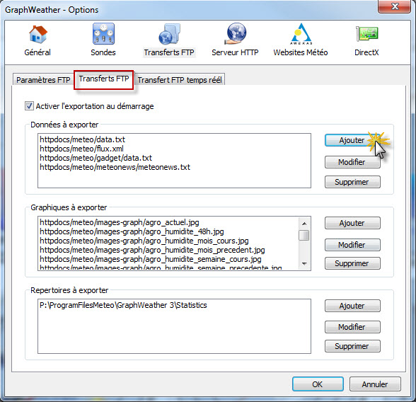 Dans GraphWeather, allez dans -> Options -> Transferts FTP, puis dans "Données à exporter", puis cliquez sur "Ajouter"
